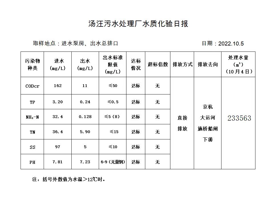 汤汪污水处理厂水质化验日报(2022.10.5)