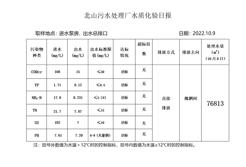 北山污水处理厂水质化验日报(2022.10.9)