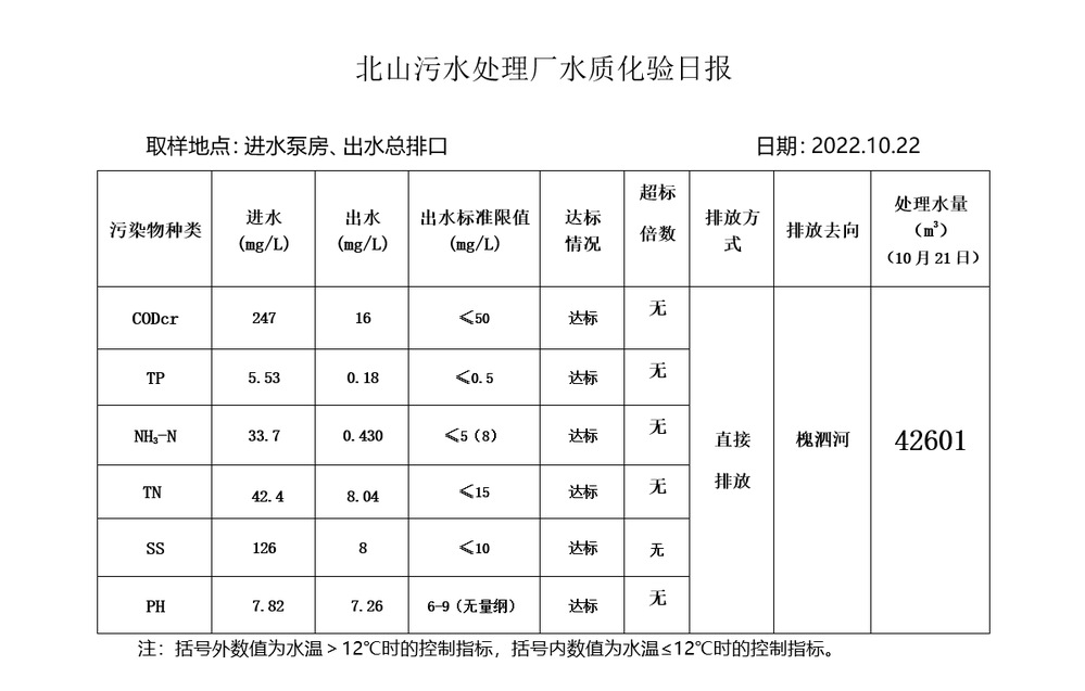 北山污水处理厂水质化验日报(2022.10.22)