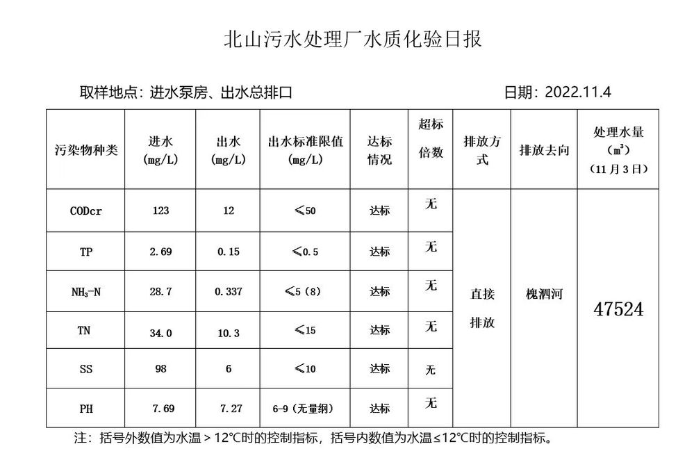 北山污水处理厂水质化验日报(2022.11.4)