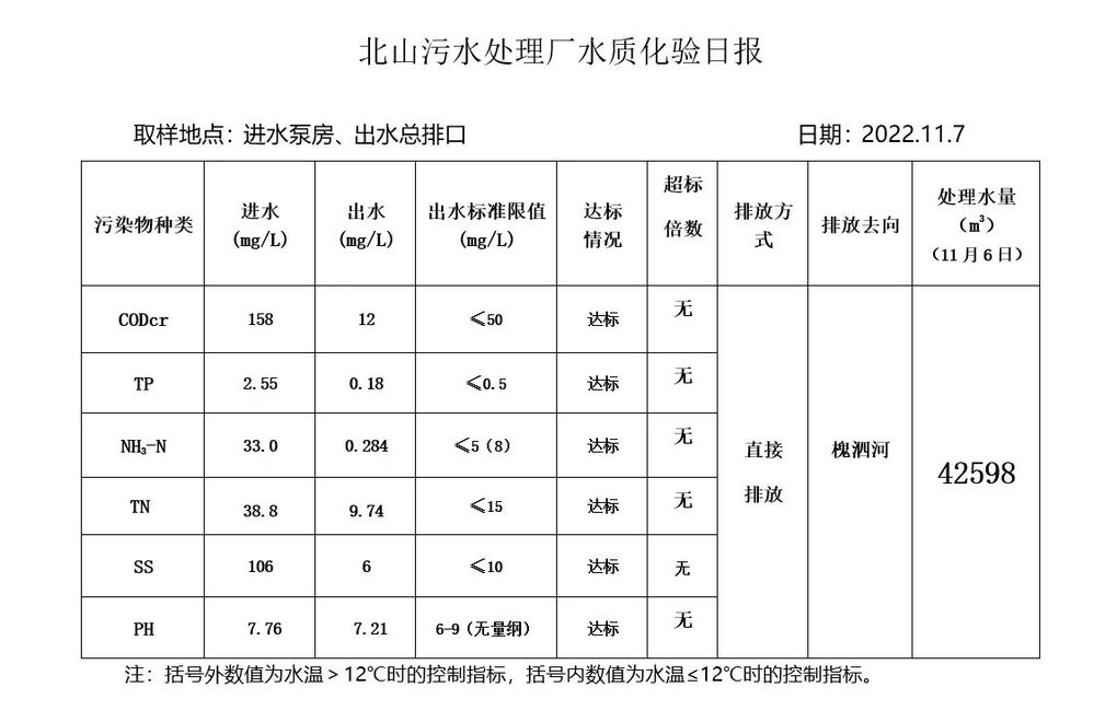 北山污水处理厂水质化验日报(2022.11.7)