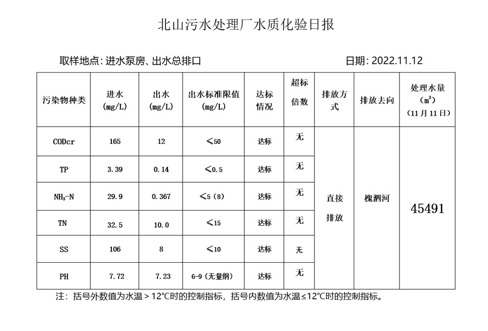 北山污水处理厂水质化验日报(2022.11.12)