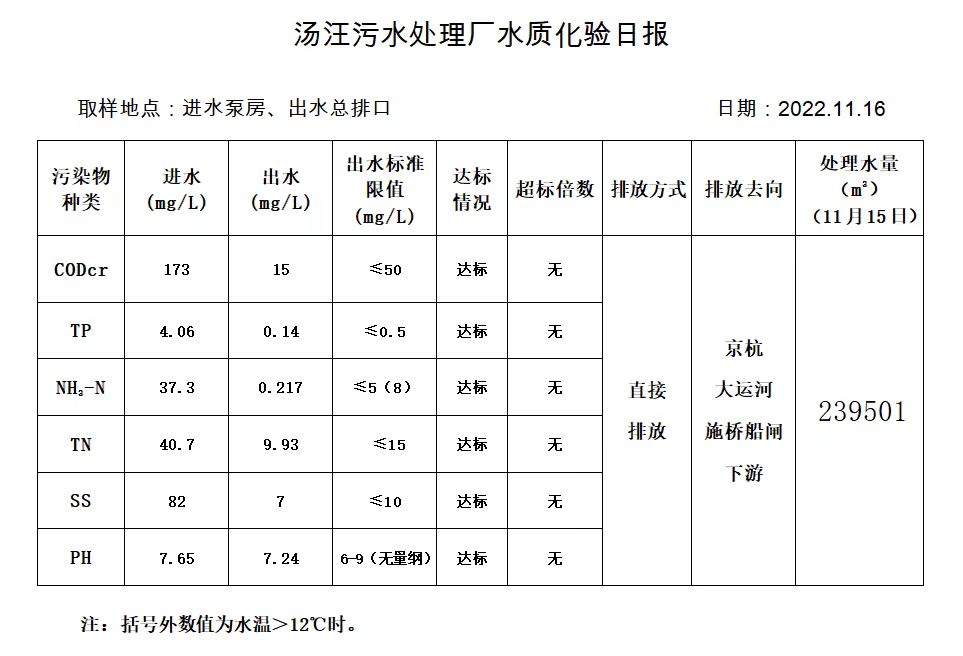 汤汪污水处理厂水质化验日报(2022.11.16)
