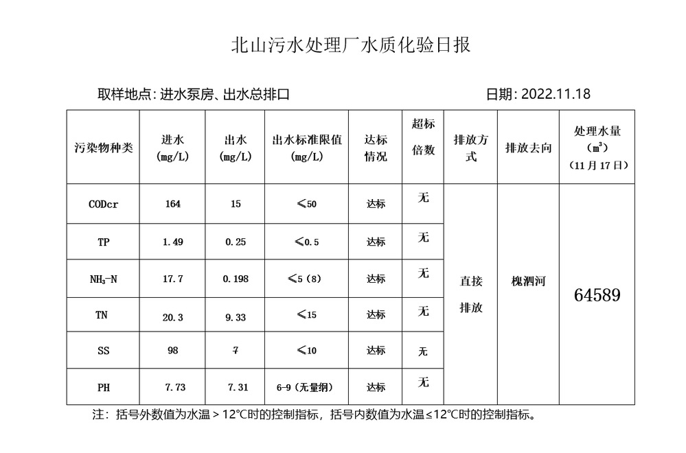北山污水处理厂水质化验日报(2022.11.18)