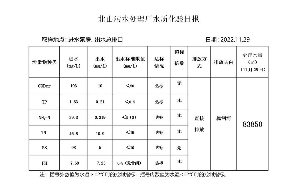 北山污水处理厂水质化验日报(2022.11.29)