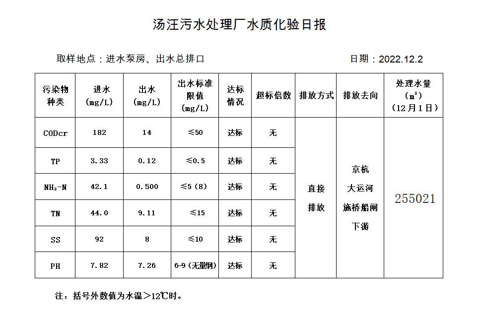 汤汪污水处理厂水质化验日报(2022.12.2)