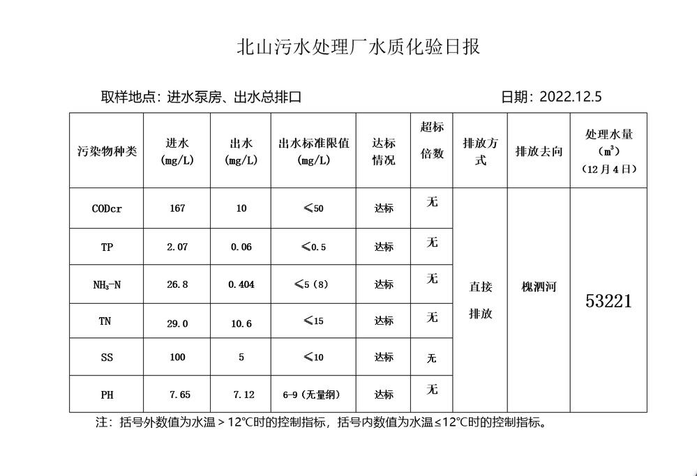 北山污水处理厂水质化验日报(2022.12.5)