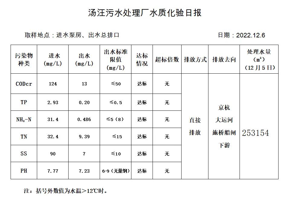 汤汪污水处理厂水质化验日报(2022.12.6)