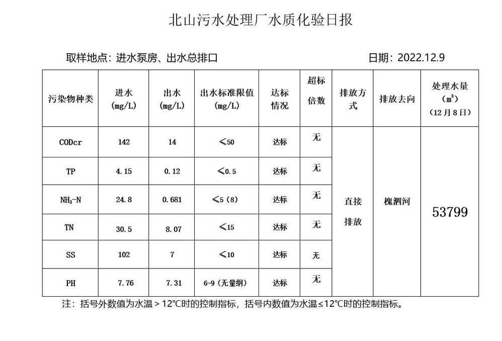 北山污水处理厂水质化验日报(2022.12.9)