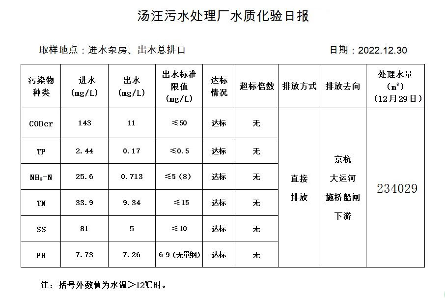 汤汪污水处理厂水质化验日报(2022.12.30)