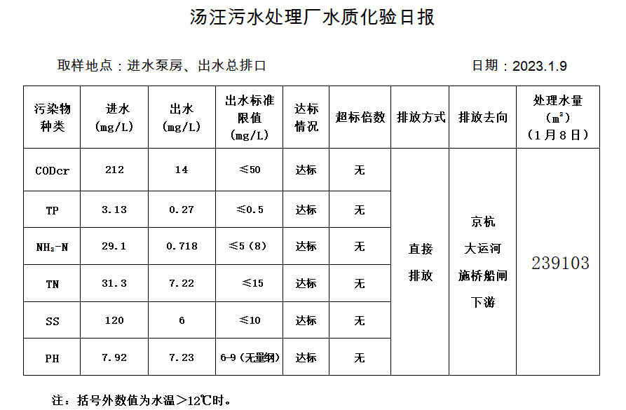 汤汪污水处理厂水质化验日报(2023.1.9)