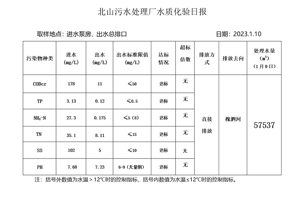 北山污水处理厂水质化验日报(2023.1.10)
