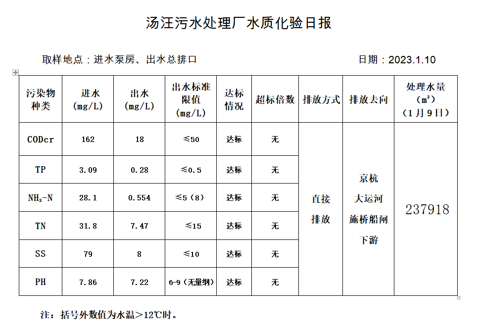 汤汪污水处理厂水质化验日报(2023.1.10)