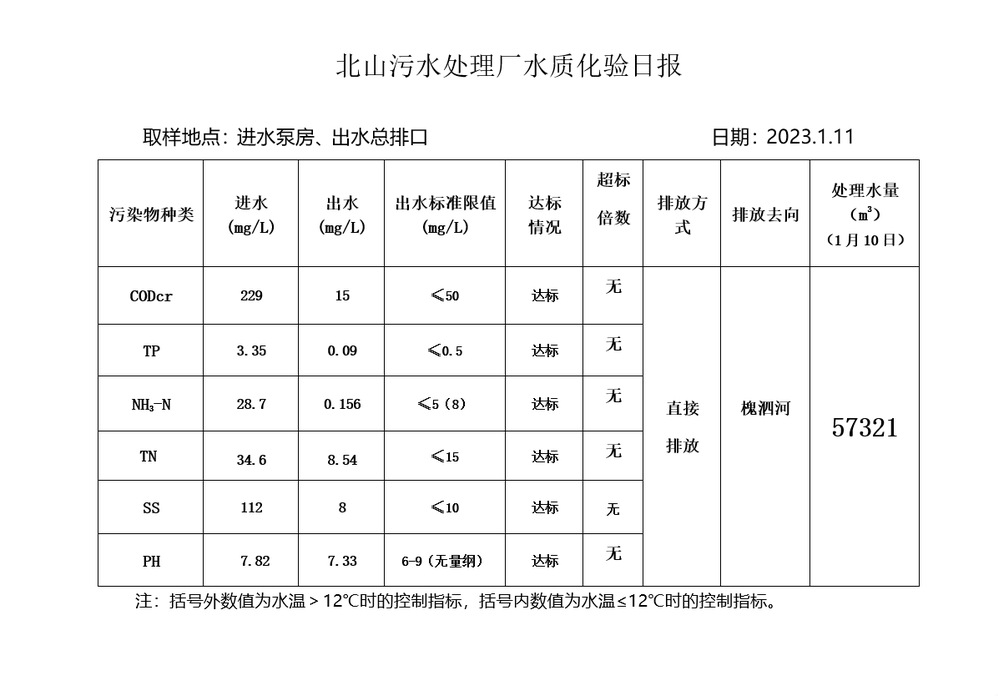 北山污水处理厂水质化验日报(2023.1.11)