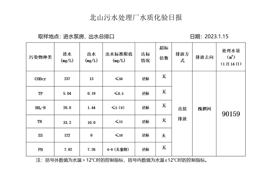 北山污水处理厂水质化验日报(2023.1.15)