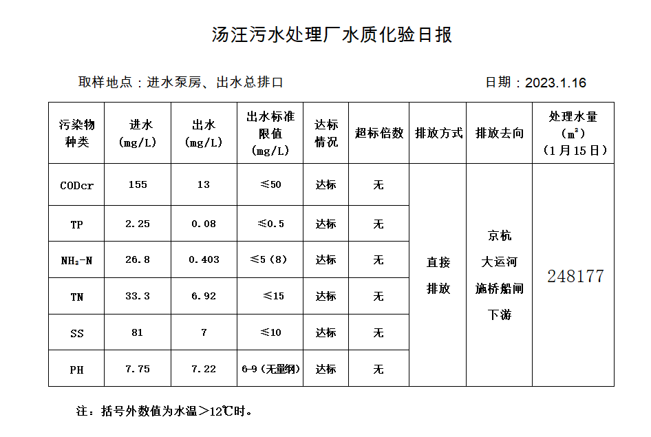 汤汪污水处理厂水质化验日报(2023.1.16)