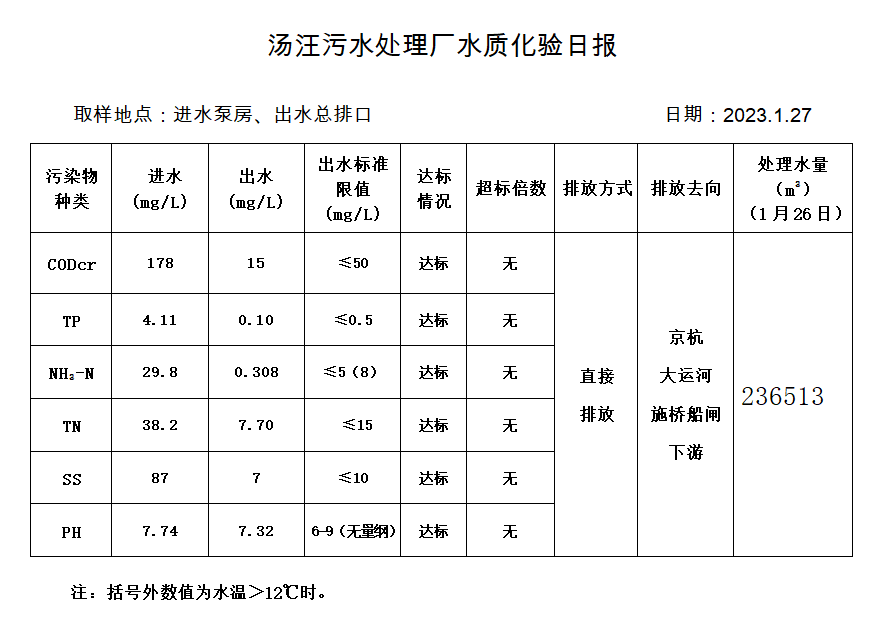 汤汪污水处理厂水质化验日报(2023.1.27)