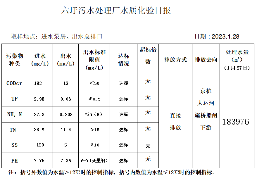 六圩污水处理厂水质化验日报(2023.1.28)