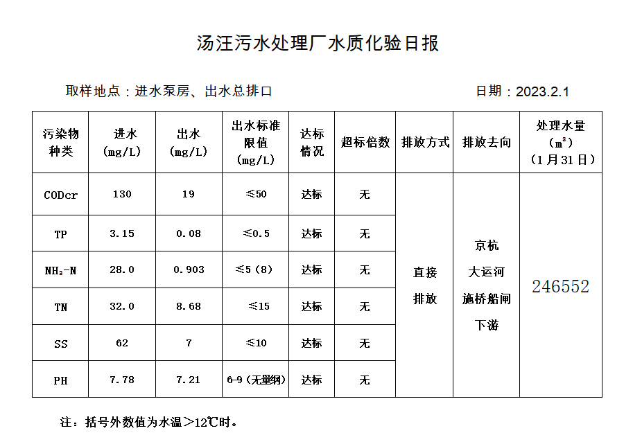 汤汪污水处理厂水质化验日报(2023.2.1)