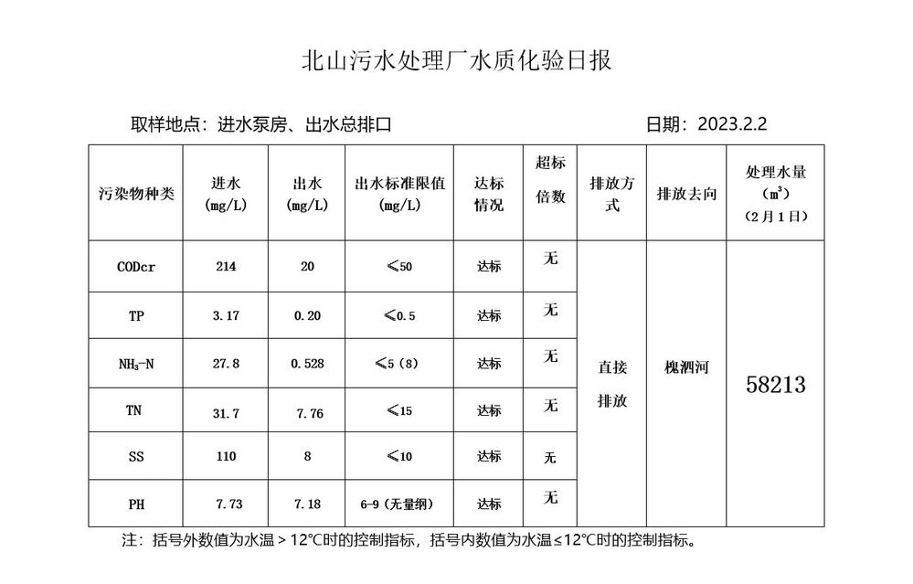 北山污水处理厂水质化验日报(2023.2.2)