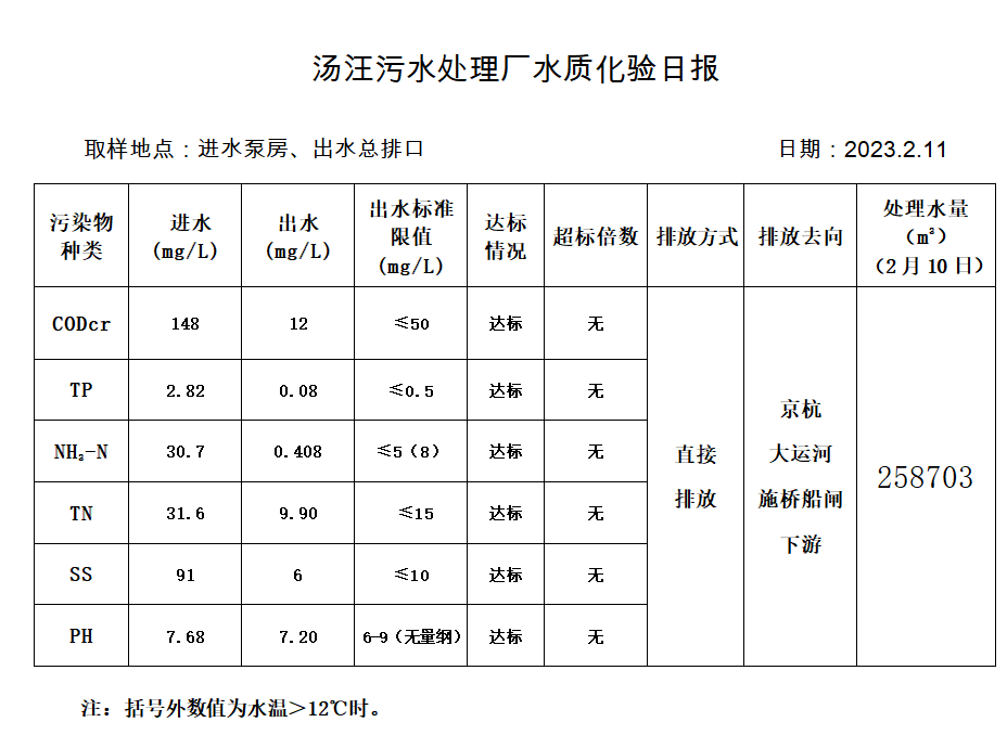 汤汪污水处理厂水质化验日报(2023.2.11)
