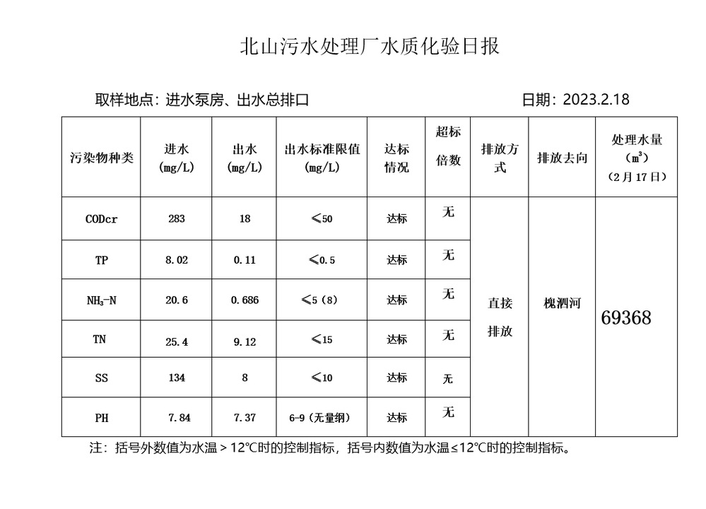 北山污水处理厂水质化验日报(2023.2.18)