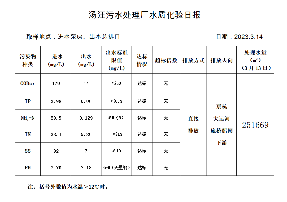 汤汪污水处理厂水质化验日报(2023.3.14)