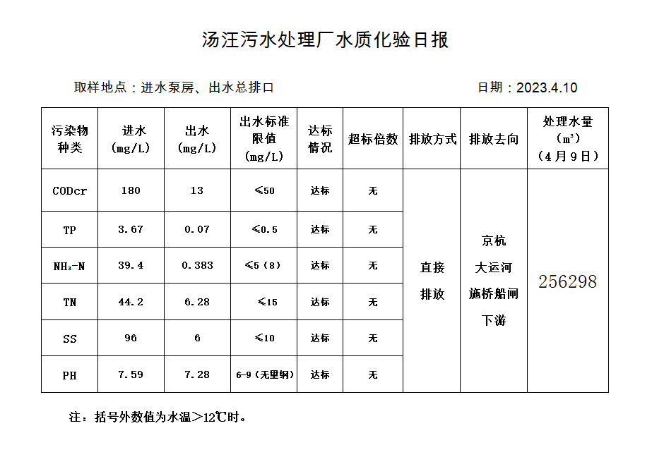 汤汪污水处理厂水质化验日报(2023.4.10)