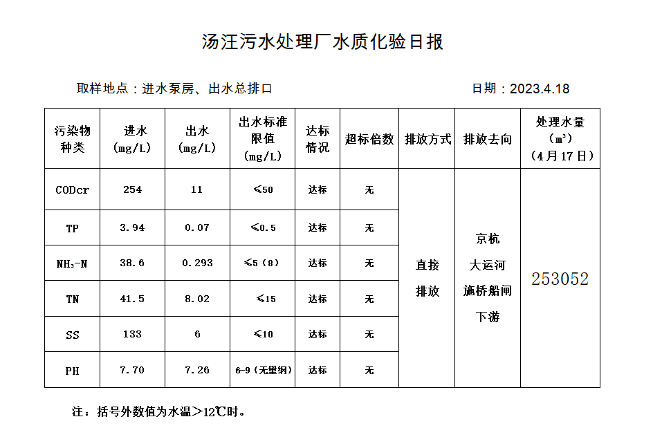 汤汪污水处理厂水质化验日报(2023.4.18)