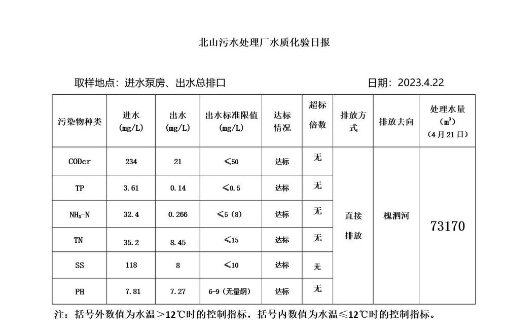 北山污水处理厂水质化验日报(2023.4.22)