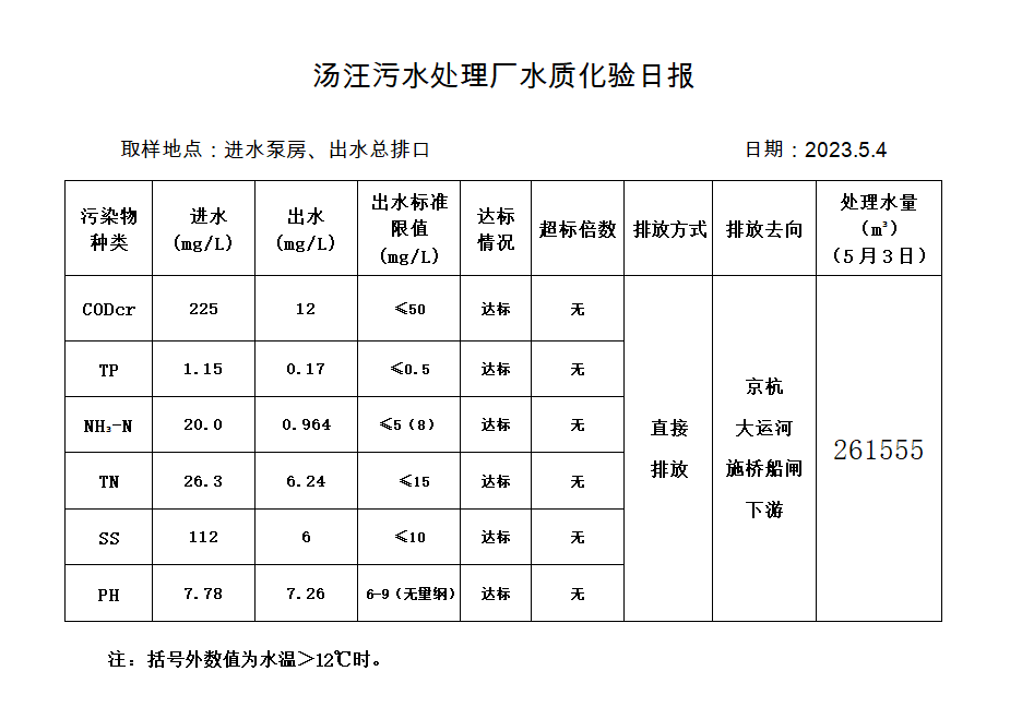 汤汪污水处理厂水质化验日报(2023.5.4)
