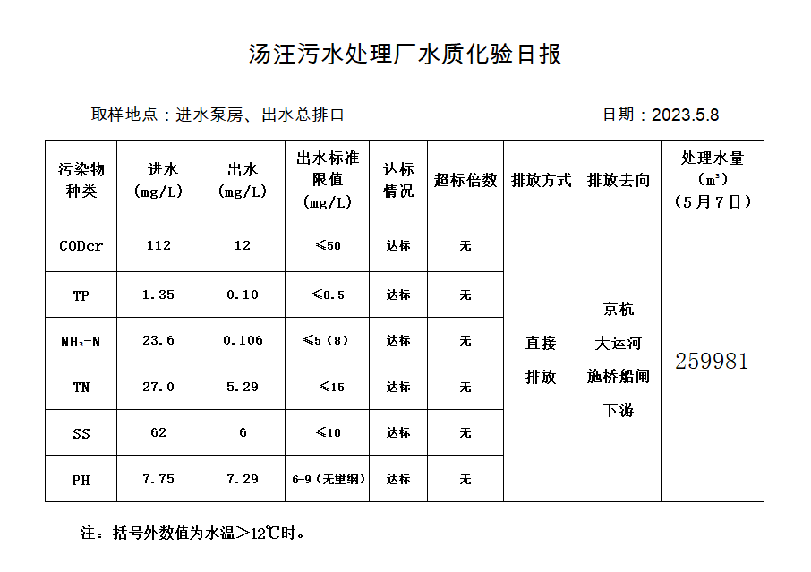 汤汪污水处理厂水质化验日报(2023.5.8)