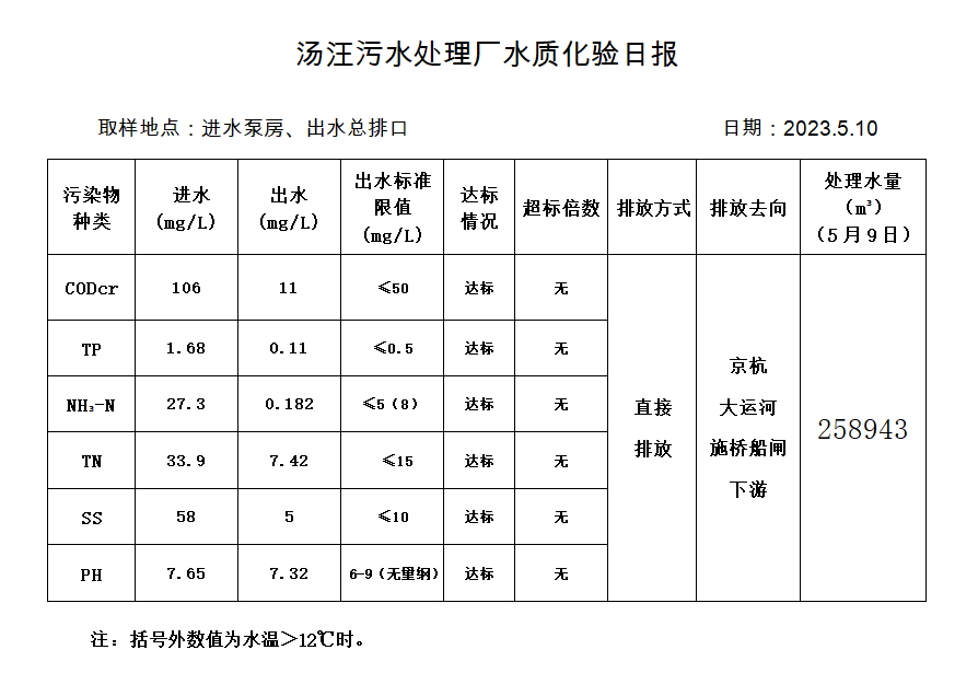 汤汪污水处理厂水质化验日报(2023.5.10)