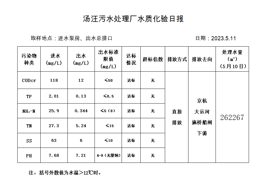 汤汪污水处理厂水质化验日报(2023.5.11)