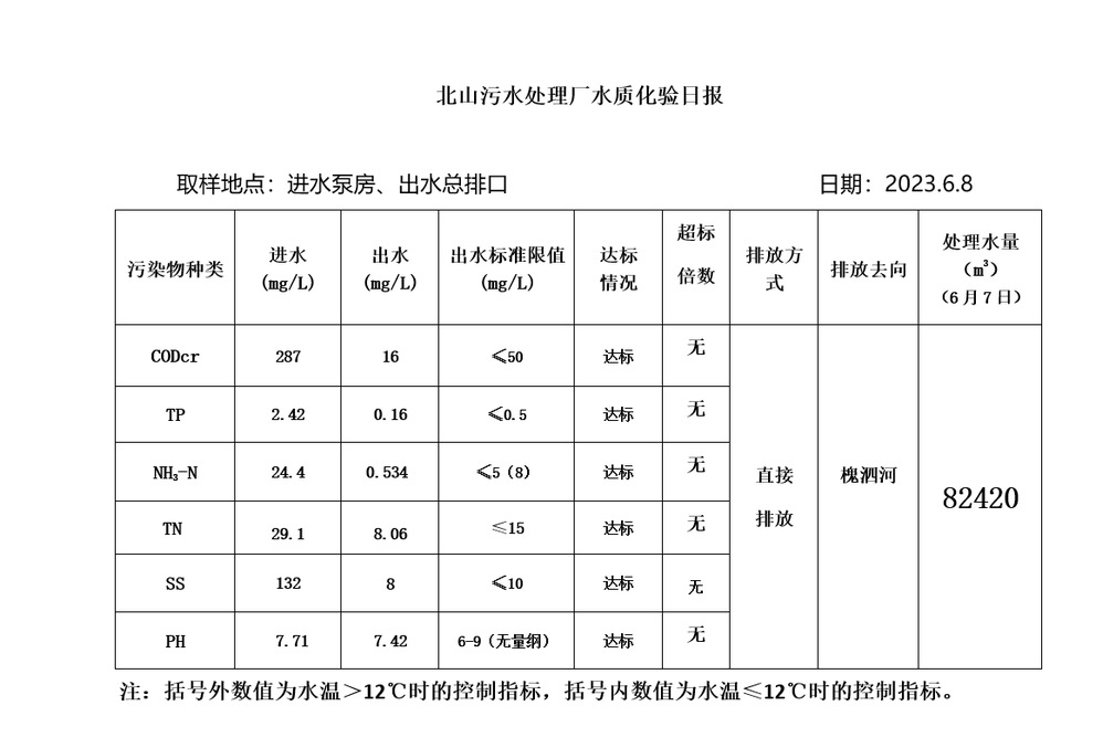 北山污水处理厂水质化验日报(2023.6.8)