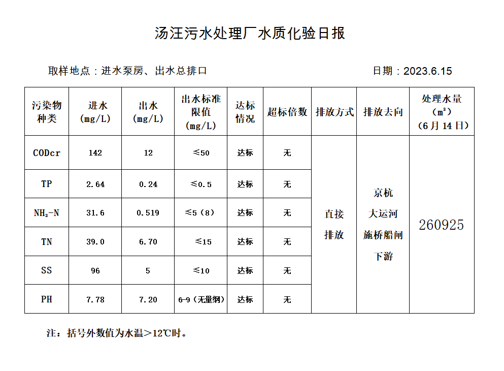 汤汪污水处理厂水质化验日报(2023.6.15)