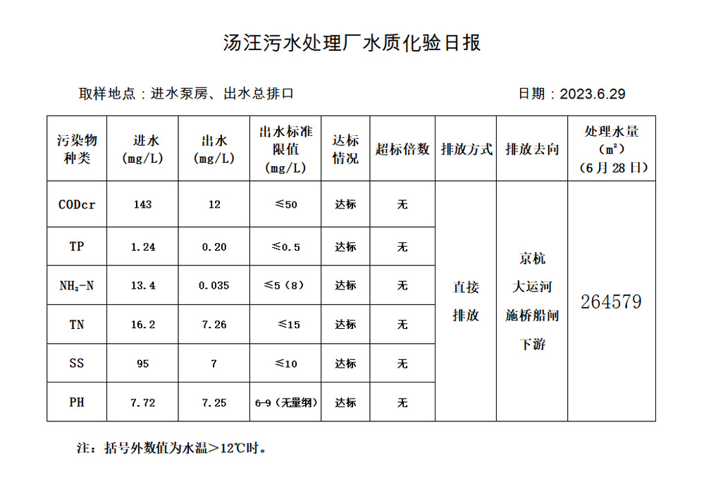 汤汪污水处理厂水质化验日报(2023.6.29)