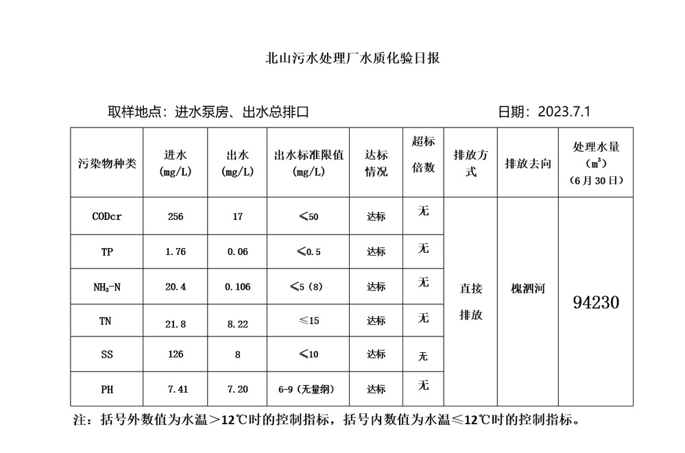 北山污水处理厂水质化验日报(2023.7.1)