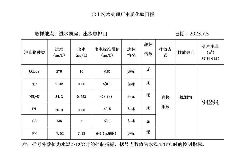 北山污水处理厂水质化验日报(2023.7.5)