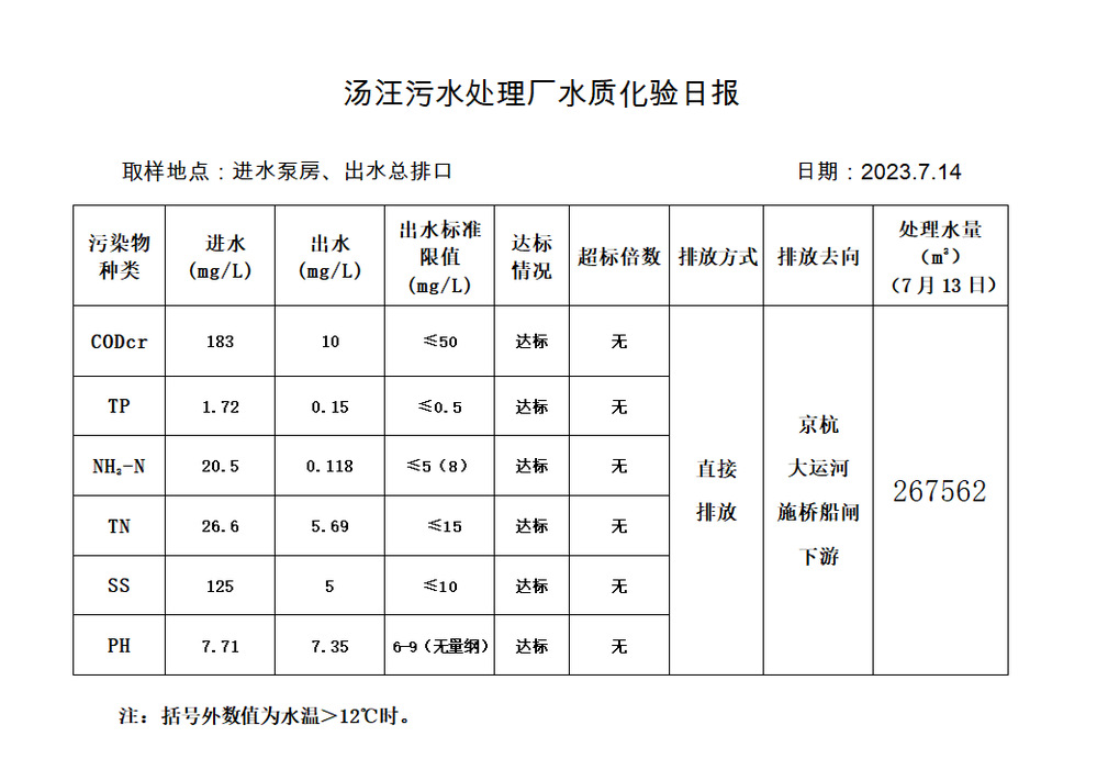 汤汪污水处理厂水质化验日报(2023.7.14)