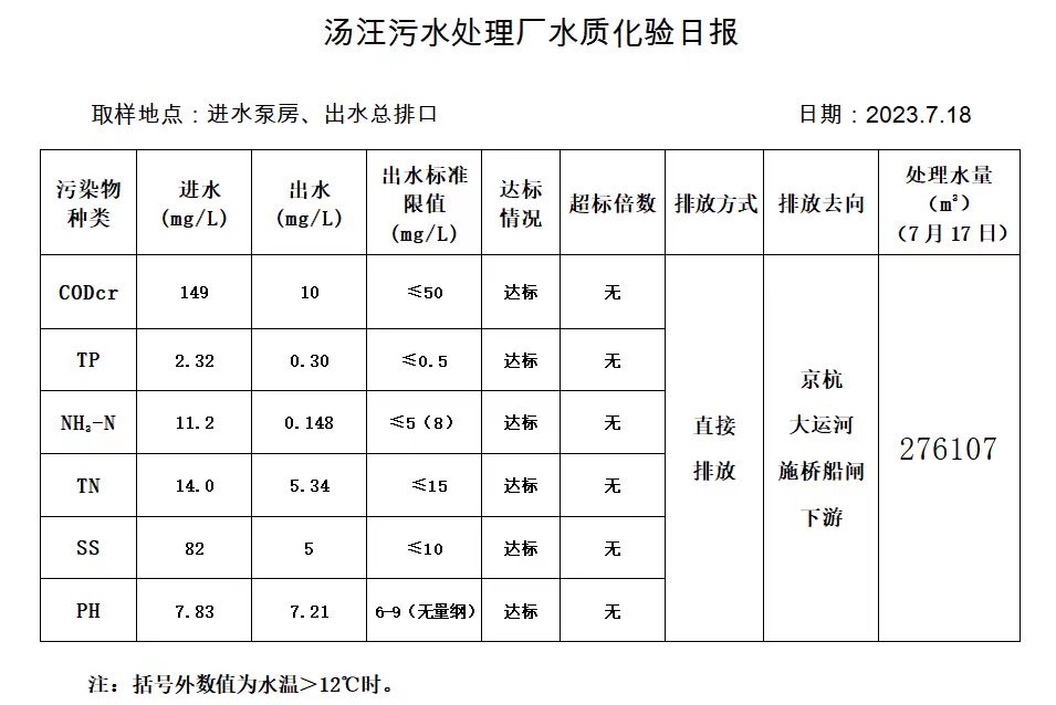 汤汪污水处理厂水质化验日报(2023.7.18)