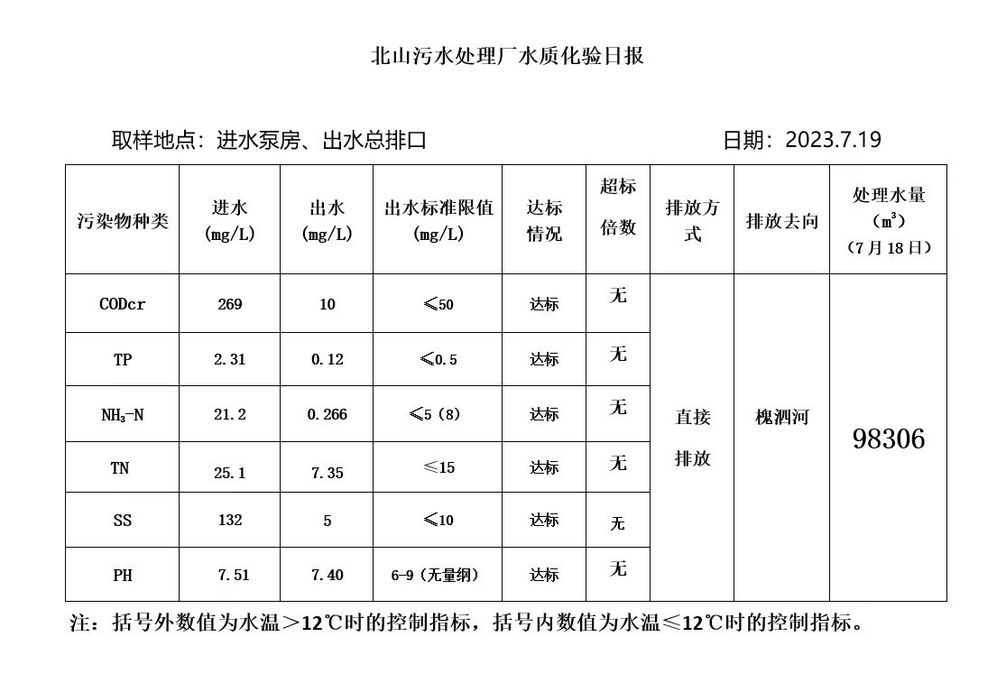 北山污水处理厂水质化验日报(2023.7.19)