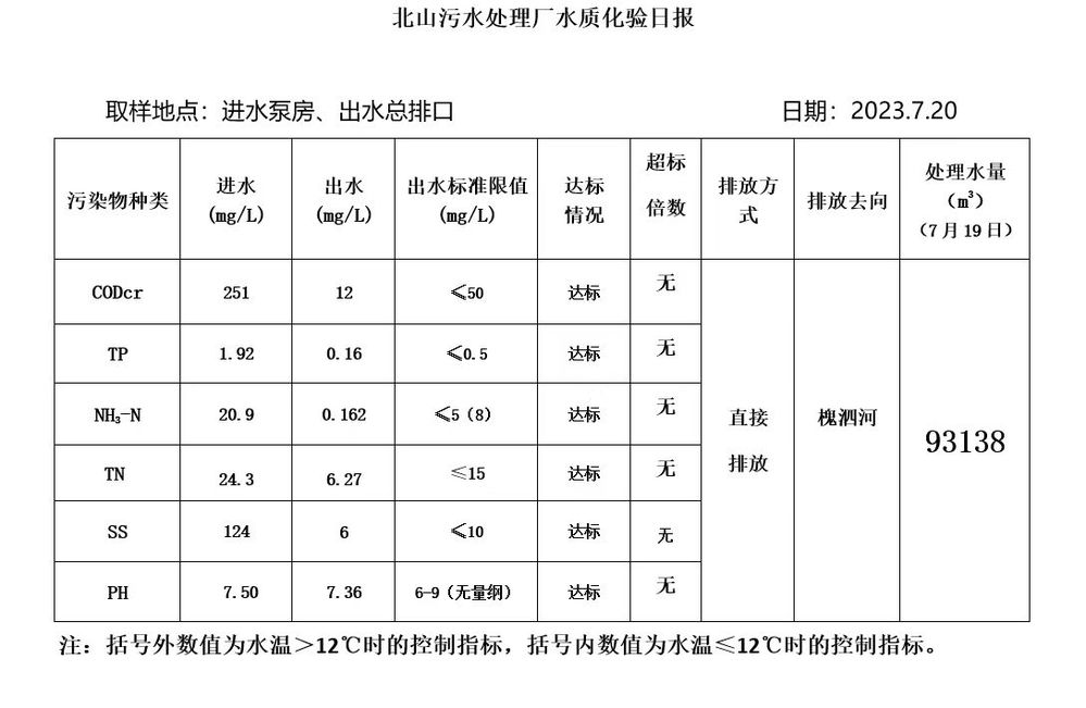 北山污水处理厂水质化验日报(2023.7.20)