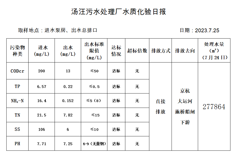 汤汪污水处理厂水质化验日报(2023.7.25)
