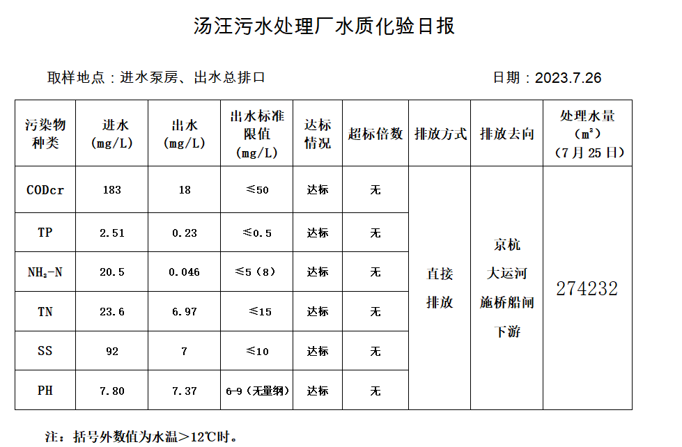 汤汪污水处理厂水质化验日报(2023.7.26)