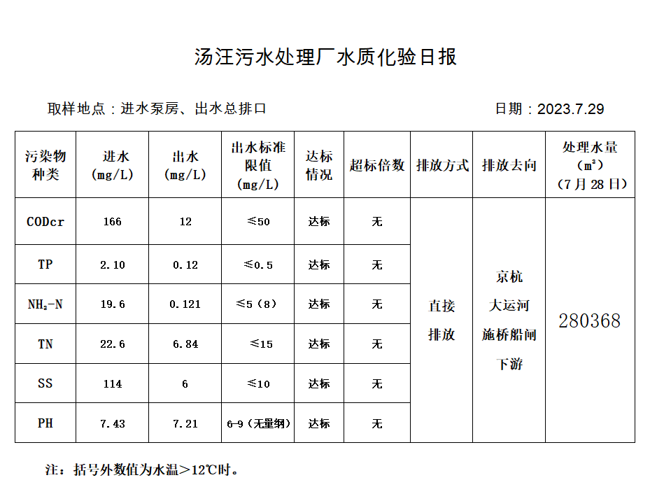汤汪污水处理厂水质化验日报(2023.7.29)