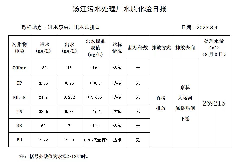 汤汪污水处理厂水质化验日报(2023.8.4)