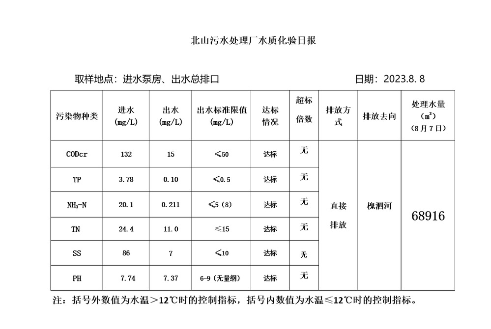 北山污水处理厂水质化验日报(2023.8.8)