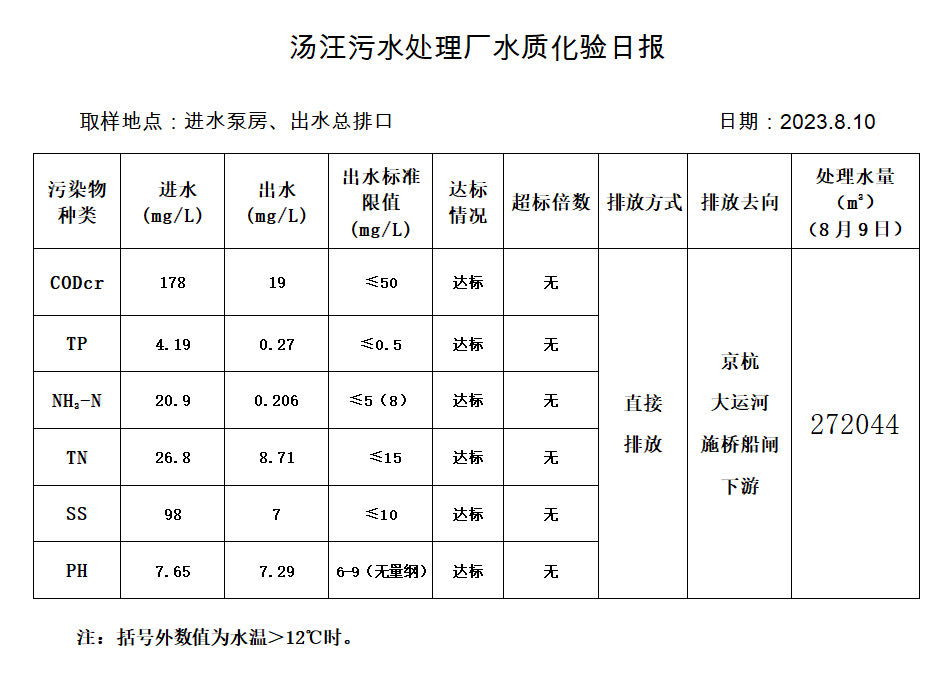 汤汪污水处理厂水质化验日报(2023.8.10)