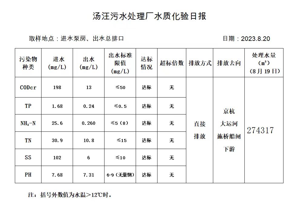 汤汪污水处理厂水质化验日报(2023.8.20)